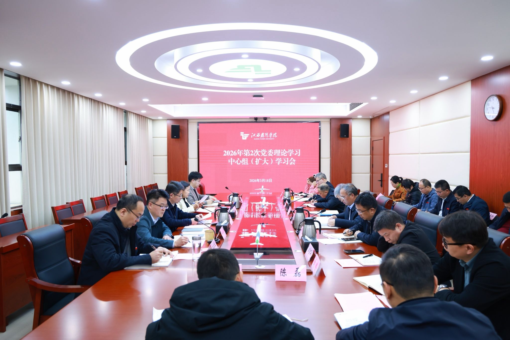 3月18日,学校召开2026年第2次党委理论学习中心组(扩大)学习会,围绕树立和践行正确政绩观开展专题学习。校党委书记陈震主持学习会并讲话,校长龙国英、党委副书记张海涛作中心发言,在家校领导参加学习。