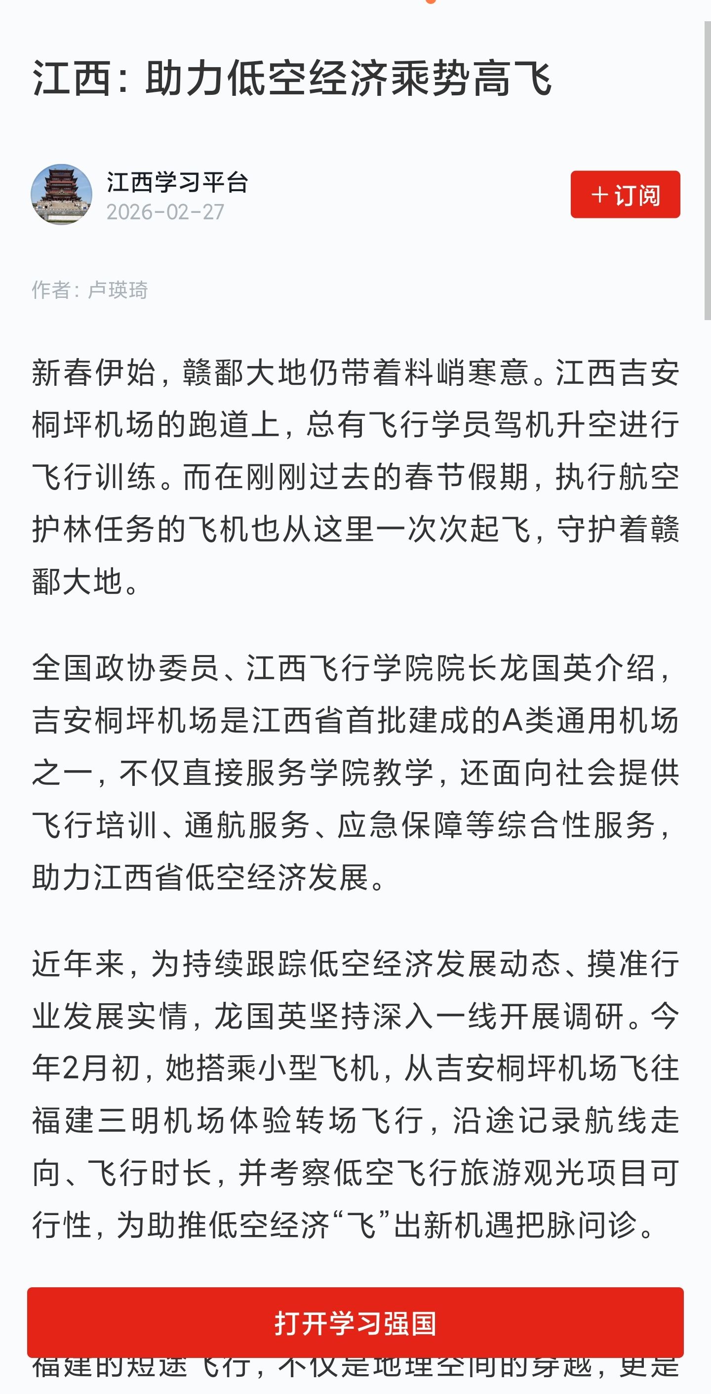 近日,学习强国报道,江西飞行学院助力低空经济乘势高飞详情如下: